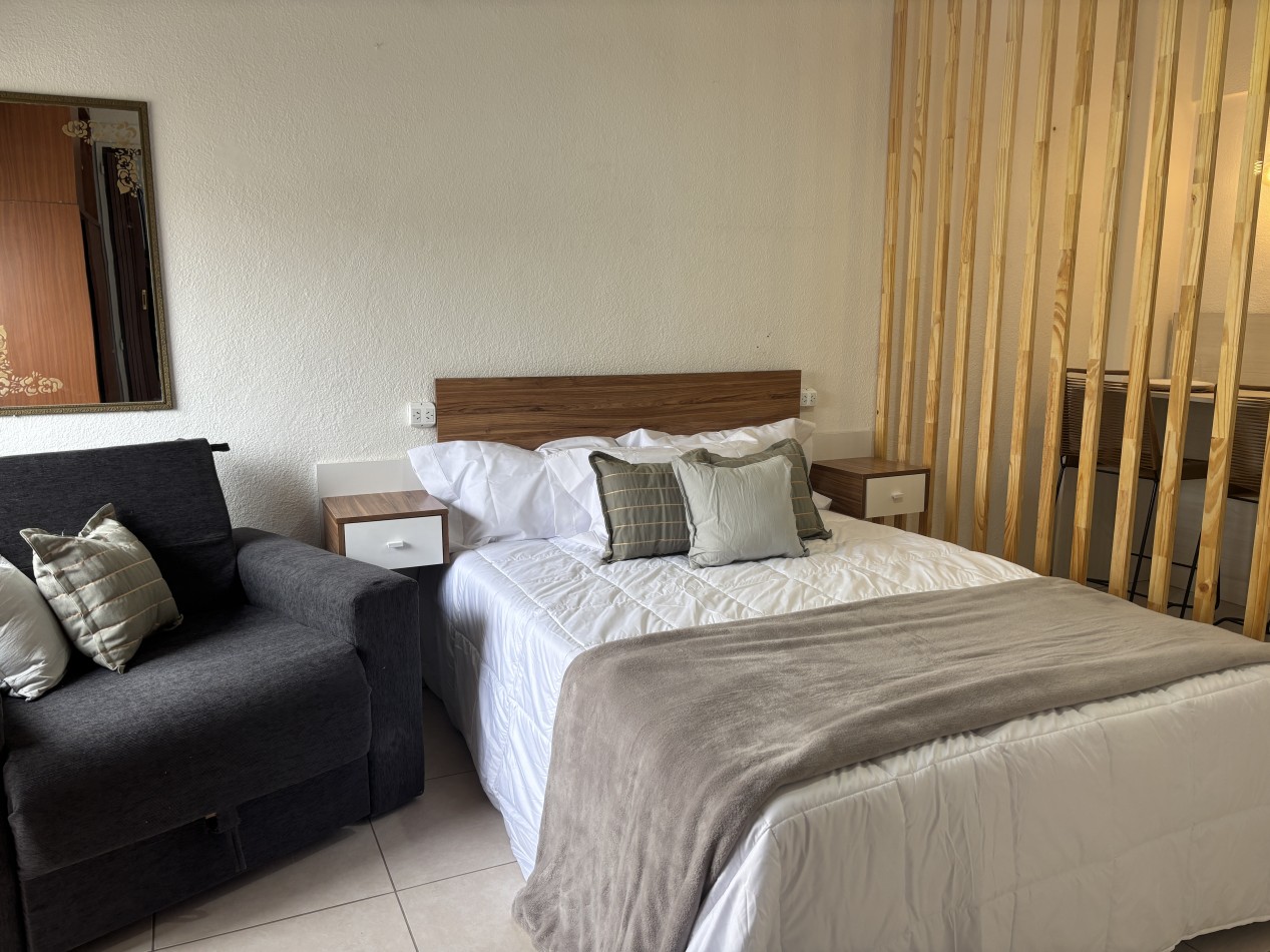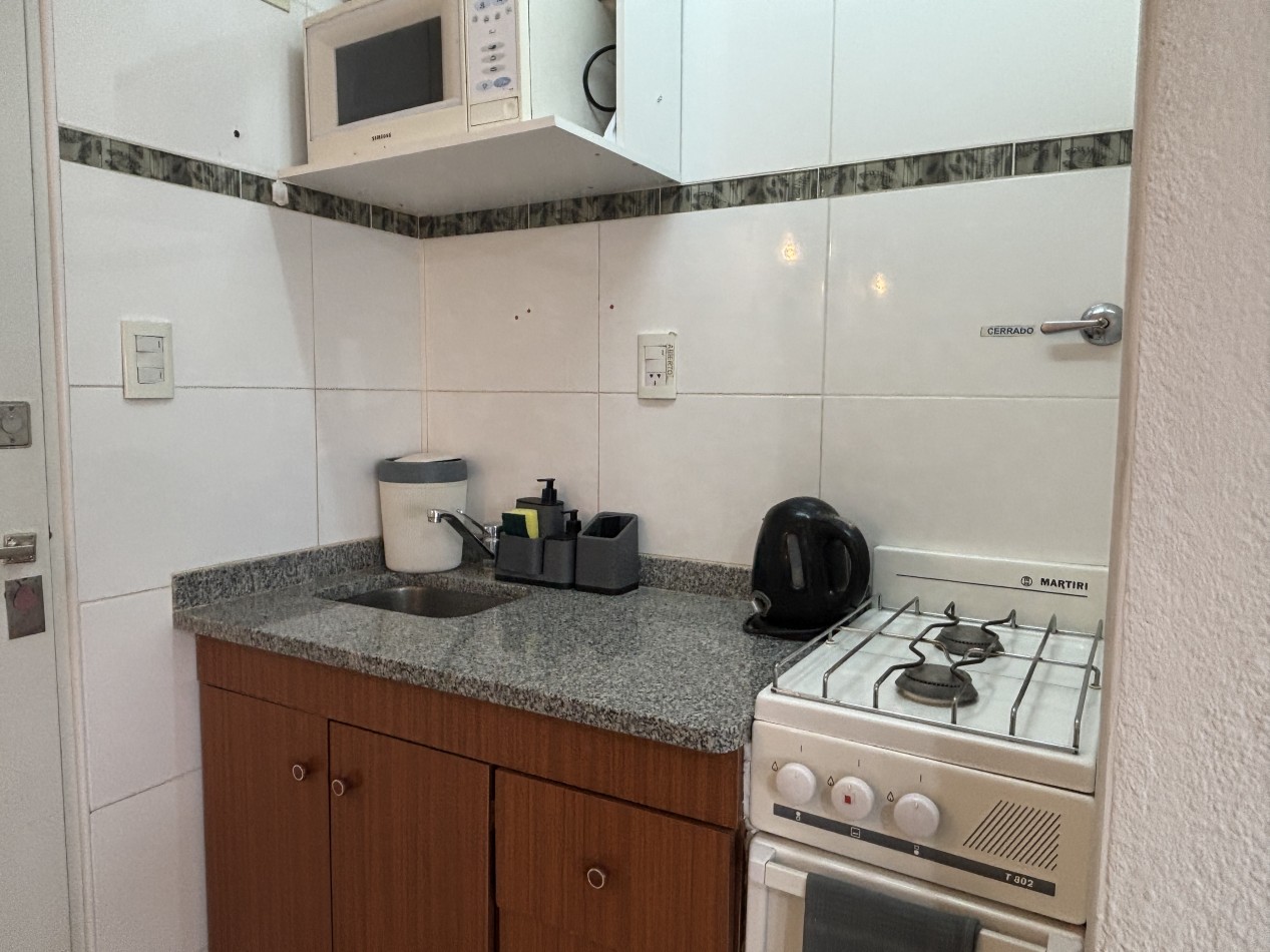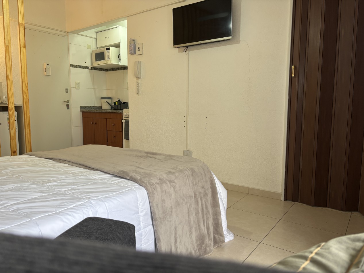 La unidad se encuentra totalmente equipada y lista para habitar. Dispone de ambiente principal con barra desayunadora realizada a medida, heladera bajo mesada, cama de dos plazas y placard móvil de dos puertas, brindando espacio de guardado funcional.