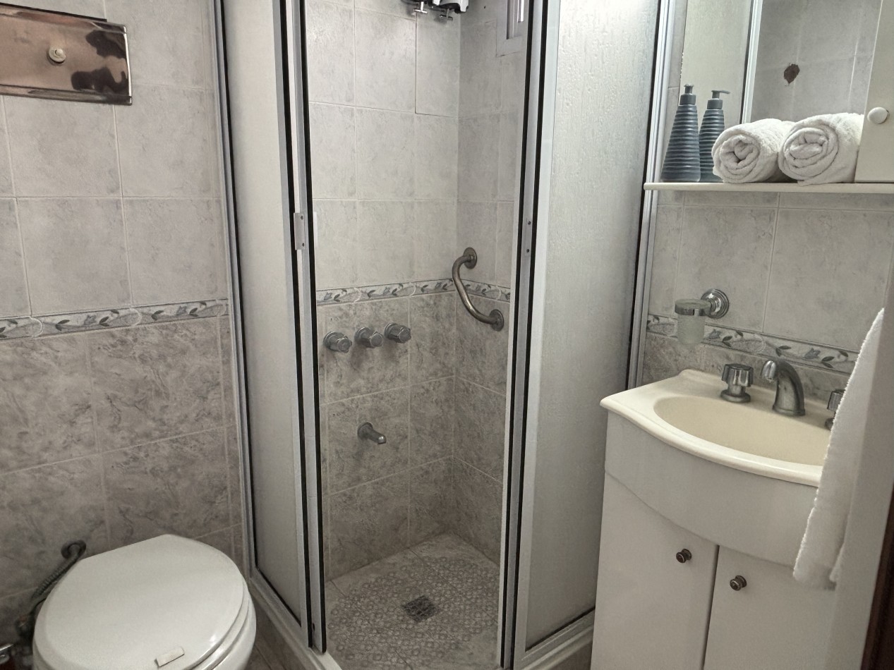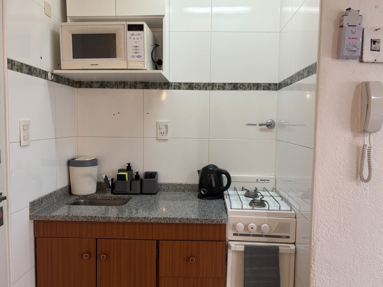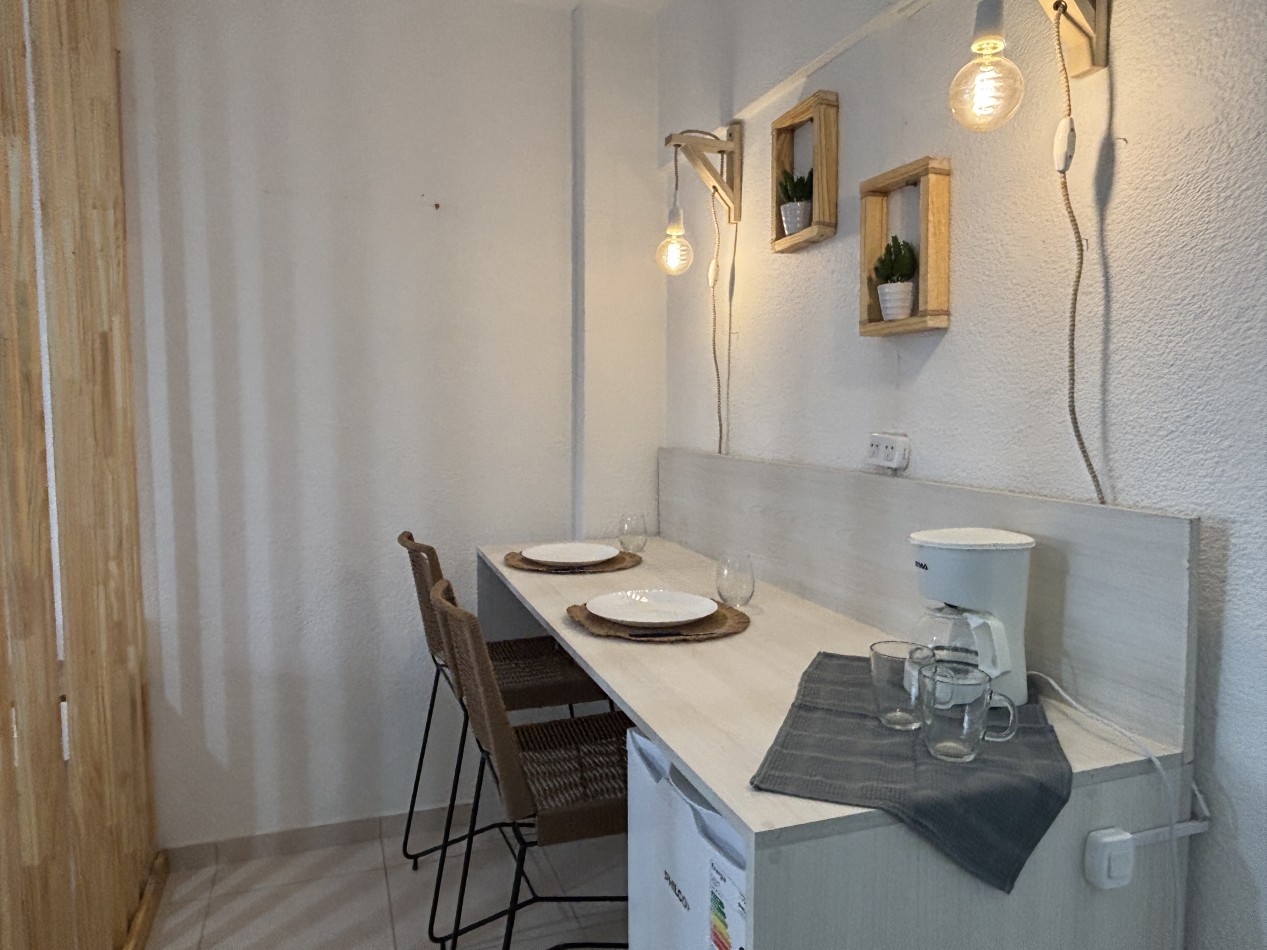 La unidad se encuentra totalmente equipada y lista para habitar. Dispone de ambiente principal con barra desayunadora realizada a medida, heladera bajo mesada, cama de dos plazas y placard móvil de dos puertas, brindando espacio de guardado funcional.