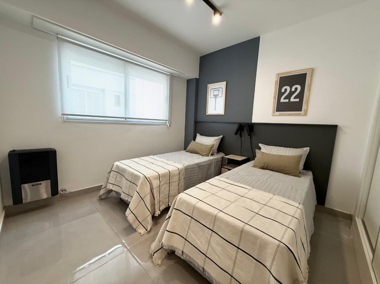 El dormitorio principal dispone de vestidor, mientras que el segundo dormitorio cuenta con placares a medida. El baño es completo y de cómoda dimensión.