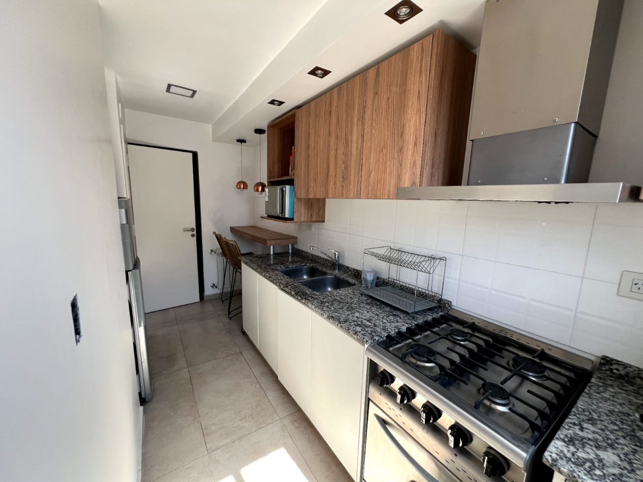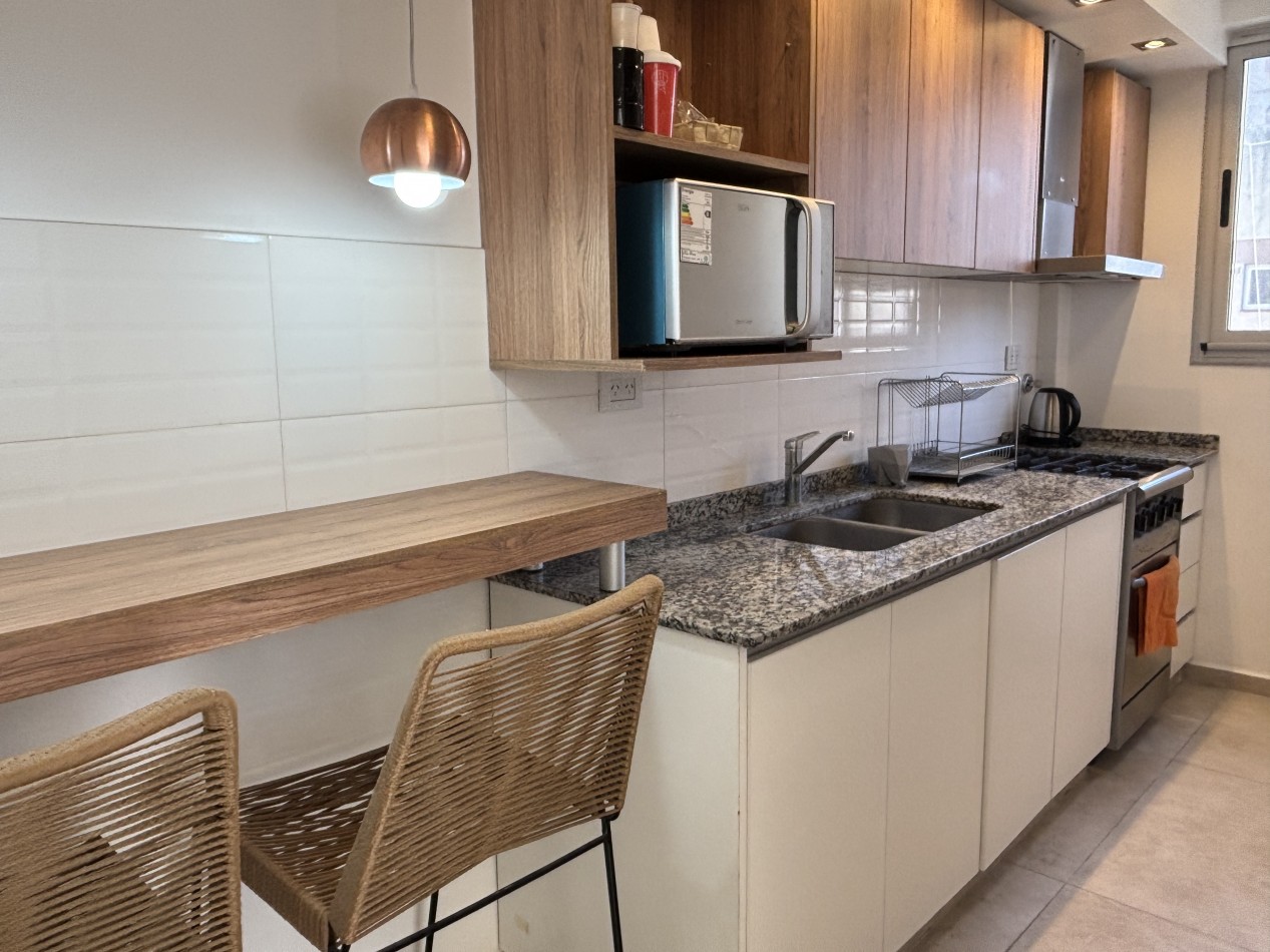 Con una superficie total de 45 m², el departamento ofrece un luminoso living-comedor con salida al balcón, lo que permite disfrutar de la vista y del aire fresco de la ciudad. La cocina se encuentra totalmente separada, equipada con amoblamientos a medida y conexión para lavarropas, pensada para brindar practicidad en el día a día. El dormitorio también da a la calle y cuenta con un amplio placard empotrado hecho a medida, maximizando el espacio de guardado. El baño es completo con ducha, de estilo moderno y funcional.